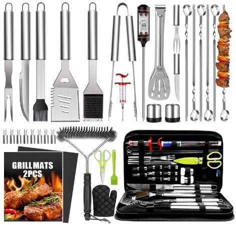 This 34-piece set features all the essential tools you need for a successful barbecue. It includes a spatula, tongs, forks, knives, and even a thermometer and grill mats. This diversity streamlines your grilling process, making it easier to manage and more enjoyable.