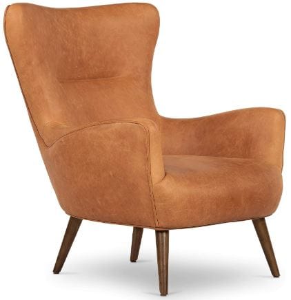 Step into luxury with our Century Modern Cognac Brown Leather Accent Chair, featuring full-grain pure-aniline dyed, non-pigmented leather that beautifully showcases the unique characteristics of each hide, delivering a truly distinctive cognac chair experience. To ensure stability and durability, our leather armchair is constructed with a corner-blocked wooden frame, reinforced joinery, and kiln-dried solid wood legs finished in walnut. The Pirelli webbing seat and back support further contribute to the reliability and comfort of our brown leather accent chair.
