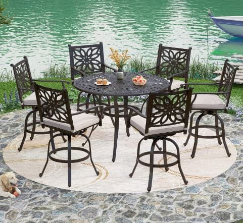 PHI VILLA presents a stunning 7-piece bar-height patio dining set, perfect for transforming your outdoor space into a luxurious retreat. This set includes six cast aluminum swivel bar stool chairs and one large, round high bar dining table. With its tasteful design, generous seating, and premium outdoor cushions, our collection is an excellent addition to any backyard oasis. Whether you have a lawn deck garden or a compact patio, this set promises to enhance your outdoor living experience.